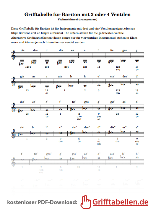 Hier gibt es eine Bariton-Grifftabelle im Violinschlüssel zum kostenlosen Download als PDF-Datei. Diese Grifftabelle für B-Bariton mit einem Tonumfang von cis bis ges''' (transponiert) ist für Instrumente mit drei und vier Ventilen geeignet (dreiventilige Instrumente erst ab dem Ton E aufwärts).
