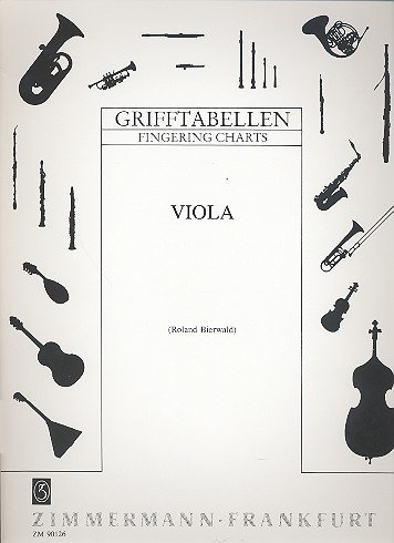Diese Grifftabelle für Viola (Bratsche) von Roland Bierwald ist im Zimmermann-Verlag erschienen und erläutert die Griffe für Bratsche in deutscher und englischer Sprache. Die Notenwerte sind im Violin- und Altschlüssel (Bratschenschlüssel) notiert und die zugehörigen Griffe auf den vier Saiten und verschiedenen Lagen werden schematisch auf einem Griffbrett dargestellt.