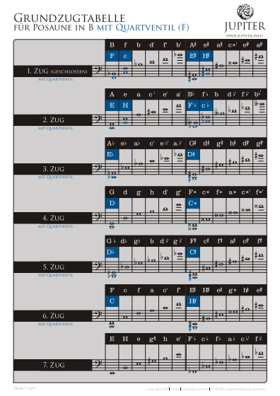 Diese kostenlose Zugtabelle für Posaune in B mit Quartventil (F) stammt vom Instrumentenhersteller Jupiter, ist im Bassschlüssel notiert und kann hier kostenlos als PDF-Datei heruntergeladen werden. In der Zugtabelle sind die Töne auf einer einzigen DIN-A4-Seite nach den einzelnen Zugpositionen gruppiert und nicht wie bei den meisten anderen Zugtabellen üblich in chromatisch aufsteigender Reihenfolge.